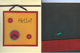 The paper buttons were cut from card stock with the Sizzix Buttons sizzlet. The narrow gross grain ribbon I bought at Michael's in the value bin. I made several color combinations. A couple were baby cards. The punched holes at the top and bottom were created with the tools in the other photo.The red plastic canvas, a push pin and a thick computer mouse pad. I think is a great use of plastic canvas. Just stick to the same corner in each square and you have a line of evenly spaced holes. Give it a try.