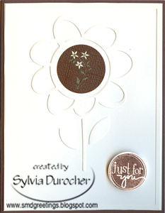 I started with a card which coordinated with the large sticker. Some were green, salmon, or brown. The white embossed flower is a Cuttlebug embossing folder. I trimmed very close to the border then glued it to the card front leave a small border of card color. I stamped the greeting in Chocolate Chip then punched it out with my 1" circle punch. I used foam tape to pop up the greeting from the card front. I then placed the large brown sticker in the centre of the flower. Quick and easy!